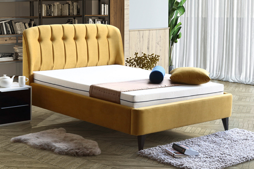- Bed frame shown in Plush Velvet Mustard (B2)